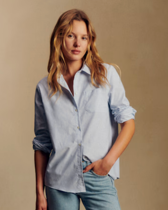 A blue striped shirt is a perfect Paris spring staple. It looks polished, effortless, and layers beautifully under a blazer or trench.